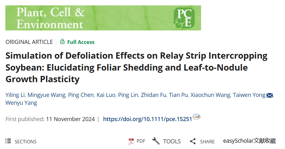 11月11日,我校农学院玉米大豆带状复合种植与循环利用团队在国际知名期刊《plant, cell & environment》上发表了题为“simulation of defoliation effects on relay strip intercropping soybean: elucidating foliar shedding and leaf-to-nodule growth plasticity”的研究论文。该研究探讨了花后大豆落叶和叶片根瘤功能性状可塑性,揭示了大豆叶片凋落和带状套作优化源库功能的新机制。