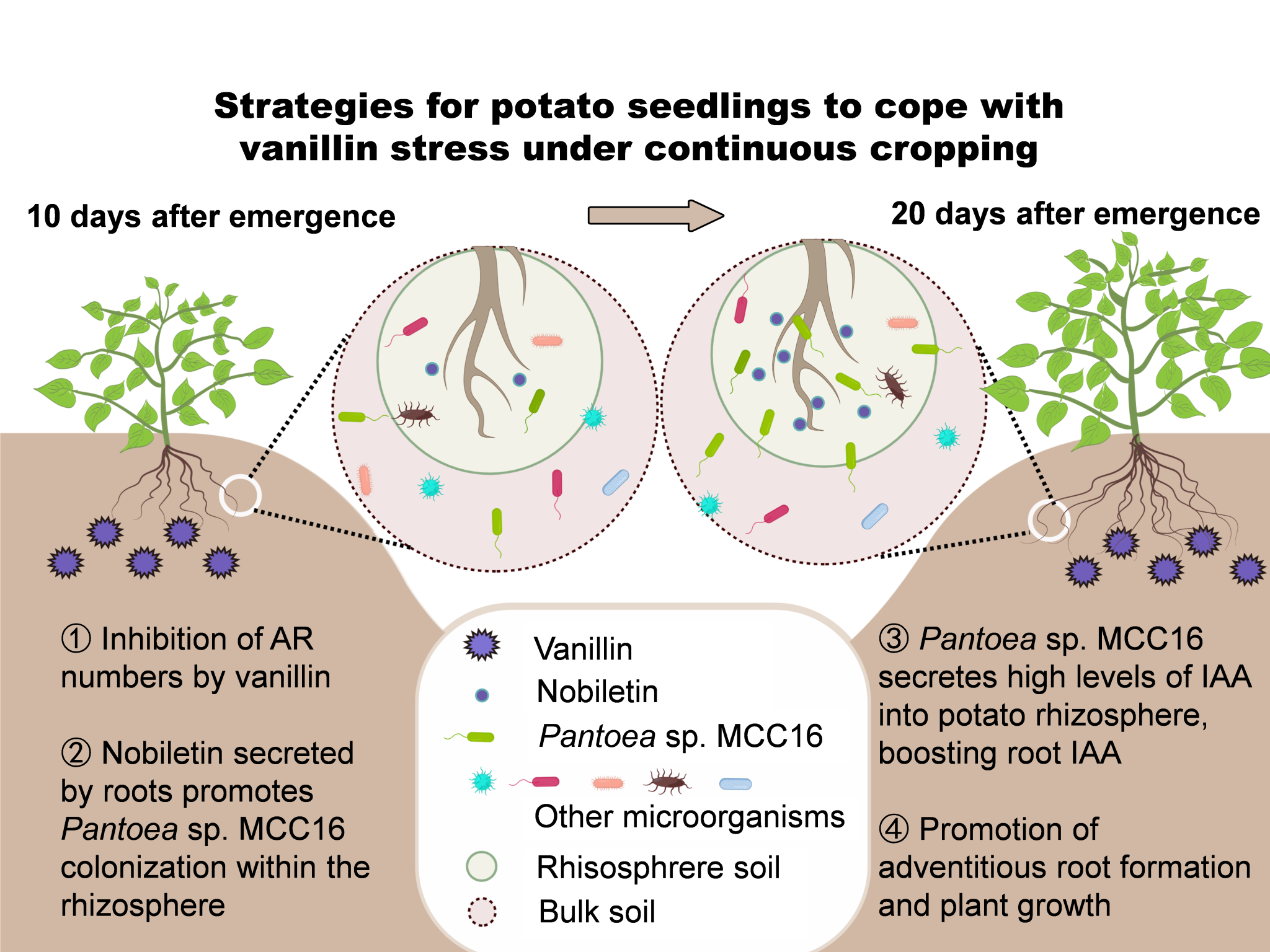 该研究通过连作土壤灭菌试验、根际菌群移植试验、目标功能菌筛选验证试验、马铃薯苗期根系分泌物浇灌试验、目标代谢物筛选验证试验、目标代谢物招募目标功能菌株试验以及目标功能菌及目标代谢物对马铃薯连作障碍缓解作用等系列试验来展开,发现马铃薯植株自主适应连作障碍主要体现在出苗后第20到第30天不定根数量的显著提升,这与连作马铃薯出苗后第20天的根际微生物提高根际土壤中iaa的水平密切相关。使用16s rrna绝对定量测序对根际细菌群落进行分析,发现连作改变了根际微生物群落结构,pantoeasp. mcc16的丰度显著增加且只在出苗后第20天出现,外源pantoeasp. mcc16菌液浇灌可显著提高连作马铃薯根际iaa水平且不定根数量显著增加。进一步研究发现,连作马铃薯出苗后第20天的根系分泌物会显著提高根际土壤中pantoeasp. mcc16丰度。根据非靶向代谢组学分析及外源代谢物浇灌试验,川陈皮素被鉴定为是招募pantoeasp. mcc16到马铃薯根际定殖的主要物质。最后在连作土壤中施用川陈皮素或pantoeasp. mcc16均可显著提高连作马铃薯产量。这些结果说明连作马铃薯可以自主分泌川陈皮素,招募高产iaa的pantoeasp. mcc16,促使植物恢复功能特性并缓解连作障碍。