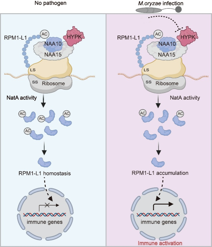 近日,我院王静教授团队与山东农业大学王永红教授团队合作在cell reports期刊发表了题为“oshypk/nata-mediated n-terminal acetylation regulates the homeostasis of nlr immune protein to fine-tune rice immune responses and growth”的研究论文,揭示了oshypk/nata介导的n末端乙酰化通过调节nlr蛋白的稳态进而调控水稻免疫反应的分子机制。本研究发现,oshypk突变体中防御相关基因表达水平显著升高,对稻瘟病的抗性显著增强。为了解析oshypk调控水稻抗病性的分子机制,研究人员系统筛选了水稻oshypk抗病表型抑制子(suppressors ofoshypk, soh)。其中,soh74能显著抑制oshypk的稻瘟病抗性,它含有一个resistance to p. syringae pv maculicola1 (rpm1)-like nlr蛋白(rpm1-l1)的突变。随后,研究人员通过免疫沉淀-质谱分析确认了rpm1-l1是oshypk/nata介导的特异修饰底物。进一步研究表明,oshypk中n端乙酰化程度下降导致rpm1-l1蛋白积累,从而增强抗病性。rpm1-l1的积累会激活水稻免疫,同时抑制植物的生长发育。在正常生长条件下,为了限制rpm1-l1的异常积累,oshypk保持高水平的表达量。当病原体入侵时,oshypk的蛋白水平显著降低,解除对rpm1-l1的抑制,激活下游的免疫反应。综上所述,本研究发掘了oshypk介导的n末端乙酰化修饰底物,解析了oshypk通过调控nlr蛋白稳态平衡水稻生长和抗病性的分子机理,为水稻抗病高产育种提供了新的思路和科学依据。
