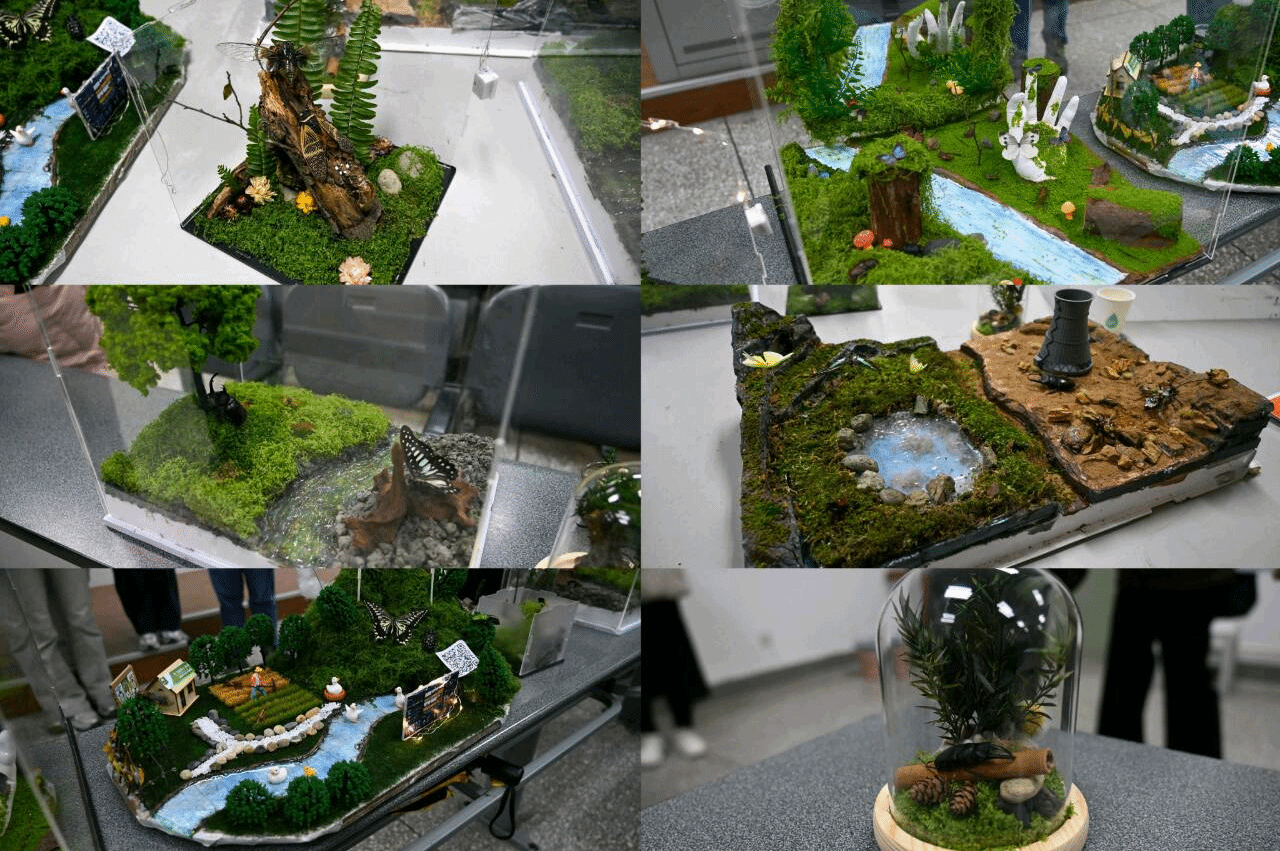 本届挑战赛分为初赛与决赛两个阶段。经严格评审,8支优秀队伍脱颖而出进入决赛。决赛现场,各参赛团队通过图文与视频结合的形式,生动展示昆虫微景观作品,围绕创作理念的灵感溯源、昆虫元素的科学甄选,到制作工艺的细节打磨,充分展现了扎实的专业功底与创新思维。作品风格各具巧思:既有荒芜与生机的生态反思,也有农机智能化的科技表达;有石膏手与自然生机的对话,也有对蝉生命周期的深刻诠释。每一件作品均构思巧妙、内涵丰富,赢得评委与观众一致好评。